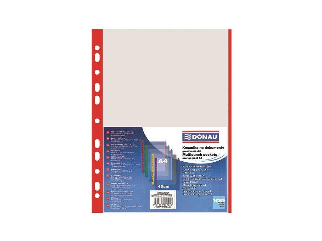 Transparentní europacky z polypropylenu s barevným euroděrováním a vnějším barevným proužkem. Otevřete shora. Formát A4. Zrnitý povrch. 100 ks baleno v sáčku.Tloušťka: 40 mikronů.