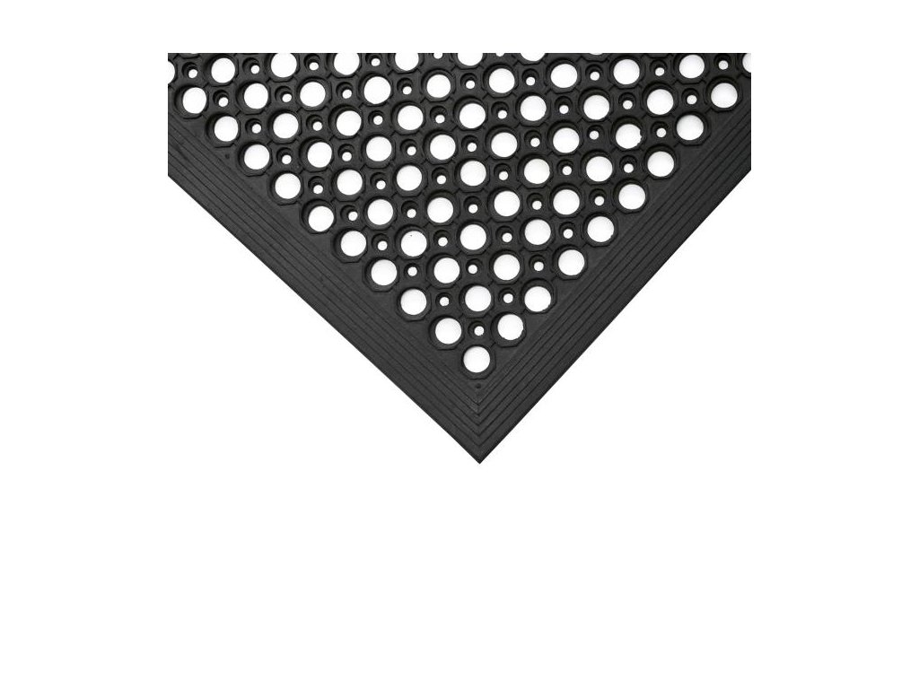 Venkovní protiúnavová podložka z oděruvzdorné pryže. Zvýšená kruhová plocha s otvory poskytuje vynikající protiskluzovou ochranu, zkosená hrana snižuje riziko zakopnutí. Výška podložky 14 mm. Podložka splňuje slovenské normy a předpisy.Rozměry: 90x150 cm
