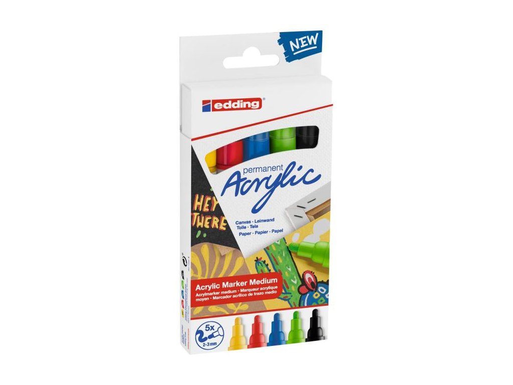 Akrylový popisovač pro malování na světlé nebo tmavé povrchy, ideální pro materiály jako plátno nebo malířský papír. Šířka kulatého hrotu je 2-3 mm. Vysoce kvalitní pigmentovaná akrylová barva na vodní bázi je po zaschnutí permanentní, neprůhledná, stálobarevná a bez zápachu. Sada obsahuje černou, dopravní červenou, hořcově modrou, dopravní žlutou a žlutozelenou. Dodává se v kvalitním, opakovaně použitelném pouzdře. K dispozici jsou vhodné náhradní hroty (náhradní hroty edding 5100). Sada 5 kusů. Základní mix barev.