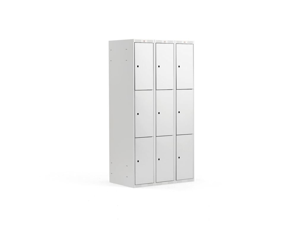 Skříňky s přihrádkami se zesílenými dveřmi s pryžovými tlumiči a výklopnými panty. V horní a spodní části mají větrací otvory. Skříňky lze doplnit různými podstavci. Přicházejí bez zámků. Skříňky s přihrádkami jsou vyrobeny z kvalitního ocelového plechu s práškovým nástřikem. Povrchová úprava práškovým lakem zajišťuje odolnost proti poškrábání při náročnějším každodenním používání. Rám a dveře jsou vyrobeny z ocelového plechu o tloušťce 0,7 mm a 0,8 mm. Tyto skříňky jsou ideální pro ukládání osobních věcí na pracovištích, v tělocvičnách, školách, na výstavách a dalších veřejných prostranstvích. Vyztužená dvířka mají gumové dorazy pro plynulé a tiché zavírání. Větrací otvory ve spodní a horní části rámu umožňují odvětrání vlhkosti a pachů. Vyberte si z různých doplňků a podle potřeby kombinujte více skříní, abyste vytvořili vhodné řešení pro uložení osobních věcí. Úložné skříňky s přihrádkami jsou dodávány bez zámků, což vám umožňuje vybrat si uzamykací systém, který nejlépe vyhovuje vašim požadavkům. Pokud bude skříň používat pouze jedna osoba, je vhodný cylindrický zámek. Pokud se obáváte, že zaměstnanci nebo studenti mohou ztratit své klíče, je výbornou volbou visací nebo kombinační zámek. Volitelný visací zámek je připevněn ke sponě. Tato možnost se doporučuje, pokud skříňky používá více uživatelů, například ve fitness centru nebo v bazénu. Pokud mnoho lidí potřebuje přístup do uzamčeného prostoru, může být kombinační zámek dobrým řešením. To je zvláště užitečné, pokud se skříňky používají na pracovišti a ne pro ukládání osobních věcí. Skříňky lze také vybavit různými typy podstavců. Základní rám pomáhá zabránit tomu, aby lidé nechali věci pod skříňkami. Nohy zvedají celou skříň nad podlahu a usnadňují úklid. To je praktické zejména v prostředí, kde je důležitá hygiena. Stojan s lavicí s úložným prostorem na boty nebo bez něj je praktický v šatnách.Buďte první, kdo napíše příspěvek k této položce.