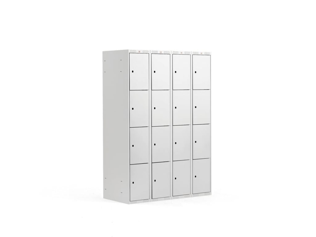 Skříňky s přihrádkami se zesílenými dveřmi s pryžovými tlumiči a výklopnými panty. V horní a spodní části mají větrací otvory. Skříňky lze doplnit různými podstavci. Přicházejí bez zámků. Skříňky s přihrádkami jsou vyrobeny z kvalitního ocelového plechu s práškovým nástřikem. Povrchová úprava práškovým lakem zajišťuje odolnost proti poškrábání při náročnějším každodenním používání. Rám a dveře jsou vyrobeny z ocelového plechu o tloušťce 0,7 mm a 0,8 mm. Tyto skříňky jsou ideální pro uložení osobních věcí na pracovištích, v tělocvičnách, školách, výstavních prostorách a dalších veřejných prostorách. Vyztužená dvířka mají gumové dorazy pro plynulé a tiché zavírání. Větrací otvory ve spodní a horní části rámu umožňují odvětrání vlhkosti a pachů. Vyberte si z různých doplňků a podle potřeby kombinujte více skříní, abyste vytvořili vhodné řešení pro uložení osobních věcí. Úložné skříňky s přihrádkami se dodávají bez zámků, což vám umožňuje vybrat si uzamykací systém, který nejlépe vyhovuje vašim požadavkům. Pokud bude skříň používat pouze jedna osoba, je vhodný cylindrický zámek. Pokud se obáváte, že zaměstnanci nebo studenti mohou ztratit své klíče, je výbornou volbou visací nebo kombinační zámek. Volitelný visací zámek je připevněn ke sponě. Tato možnost se doporučuje, pokud skříňky používá více uživatelů, například ve fitness centru nebo v bazénu. Pokud mnoho lidí potřebuje přístup do uzamčeného prostoru, může být kombinační zámek dobrým řešením. To je zvláště užitečné, pokud se skříňky používají na pracovišti a ne pro osobní skladování. Skříňky lze také vybavit různými typy podstavců. Základní rám pomáhá zabránit tomu, aby lidé nechali věci pod skříňkami. Nohy zvedají celou skříň nad podlahu a usnadňují úklid. To je praktické zejména v prostředí, kde je důležitá hygiena. V šatnách je praktický podstavec s lavicí i bez ní a úložným prostorem na boty.Buďte první, kdo napíše příspěvek k této položce.