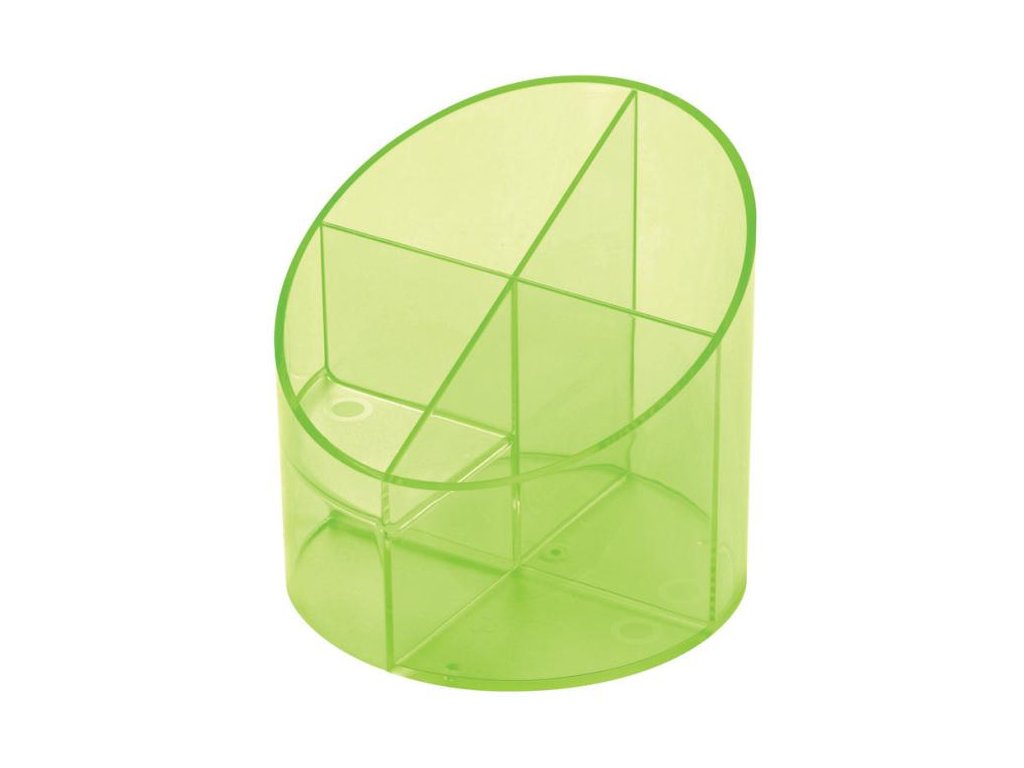 Stojan se čtyřmi přihrádkami na pera, tužky a kancelářské drobnosti z plastu v ekonomickém provedení. Výška 105 mm, průměr 110 mm. Barva transparentní zelená.Doplňkové parametry
