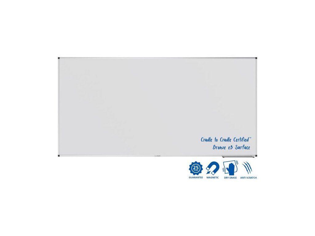Robustní a udržitelná bílá tabule pro časté použití v kanceláři, učebně nebo průmyslovém prostředí. Vhodné pro psaní pomocí suchých fixů na tabuli. Magnetický smaltovaný ocelový povrch s použitím e3 Ceramic Steel, což je Cradle to Cradle Certified™ na úrovni bronzu. Hliníkový rám s šedými plastovými rohovými krytkami (Pantone 433C). Lze namontovat vodorovně nebo svisle. Včetně držáku popisovačů (30 cm), montážní sady a montážního návodu. Rozměry: 90 x 120 cm.Doplňkové parametry