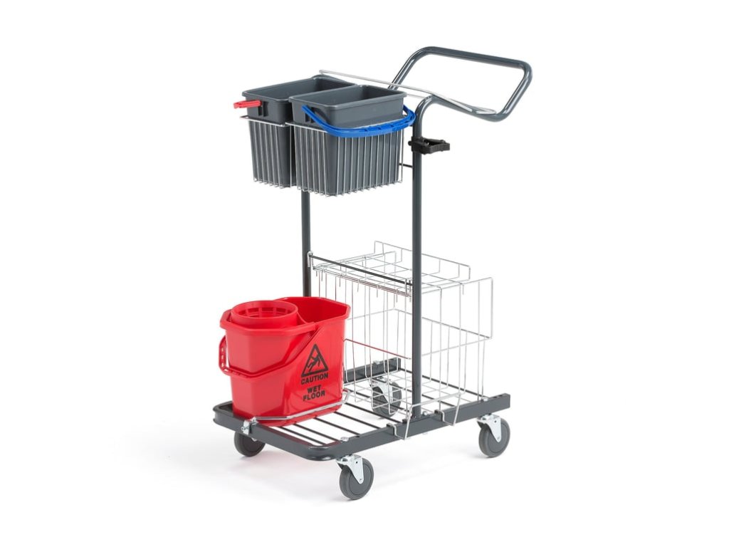 Kompaktní úklidový vozík s mopem, který nezabere mnoho místa v místnosti. Dodáváno včetně dvou 6l kbelíků, 12l kbelíku na mop, držáku pytlů na odpadky, 3 drátěných košů, 2 držáků na smeták/mop, police a držáku hlavy mopu. Tento flexibilní úklidový vozík je vhodný jako pomocník pro vytírání podlah a úklid v kancelářích, konferenčních centrech, školních učebnách, šatnách a vstupních prostorách. Je připravena na vše, co byste mohli potřebovat pro efektivní čištění. Díky svým malým kompaktním rozměrům se hodí zejména do vnitřních prostor, kde není tolik prostoru pro manévrování a kde jsou menší úklidové místnosti. Úklidový vozík je dodáván včetně dvou 6L kbelíků, 12L kbelíku na mop, držáku na pytle na odpadky a 3 drátěných košů na úklidové prostředky atd. Na boční straně má 2 držáky na smeták nebo mop, univerzální polici a držák na hlavu mopu.Buďte první, kdo napíše příspěvek k této položce.