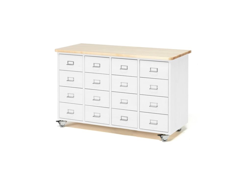 Komoda na kolečkách, 16 zásuvek, madlo s držákem štítků, bílá