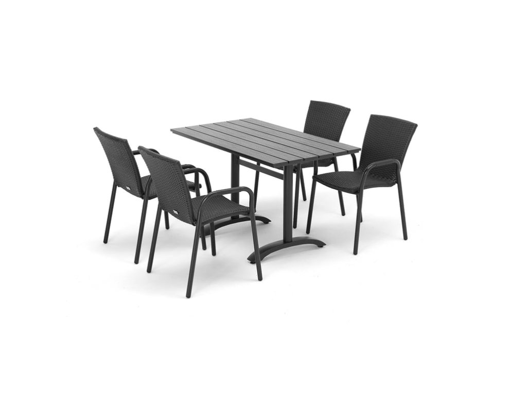 Sada odolného zahradního nábytku s nenáročnou údržbou. Stůl se stylovou deskou imitující dřevo a stohovatelné židle. Praktická sestava zahradního nábytku pro vytvoření příjemného posezení vhodná na venkovní zahrádky kaváren a restaurací nebo kancelářské terasy apod. Nábytek je vyroben z velmi odolných materiálů, které v podstatě nevyžadují žádnou údržbu. Stůl má jednoduchý design. Základna je vyrobena z robustních černých hliníkových trubek. Plastová deska stolu je vyrobena z černého umělého dřeva Aintwood, které se skvěle hodí na zahradní nábytek, protože nezadržuje vlhkost, je pevné a odolné proti nárazům. Židle jsou praktické, pohodlné a elegantní. Mají lehkou, ale stabilní konstrukci z hliníkových trubek, které spojují nohy s podpěrami. Je možné je stohovat na sebe, při skladování nezaberou mnoho místa. Sedák a opěrák jsou vyrobeny z odolného umělého ratanu.Buďte první, kdo napíše příspěvek k této položce.