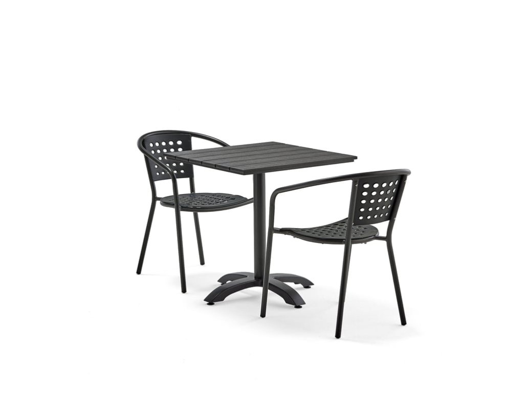 Malá zahradní sada, která je atraktivní, snadno se čistí a je ideální do venkovních prostor. Zahradní židle jsou stohovatelné, mají nízkou hmotnost a vestavěné područky. Čtvercová deska stolu je vyrobena z odolné stylové imitace dřeva, která je upevněna na odolném rámu. Atraktivní sada zahradního nábytku pro venkovní použití. Tato sada venkovního nábytku má jednoduchý, moderní design, je odolná a snadno se čistí. Skvěle se hodí na terasu na pracovišti nebo do venkovních jídelen. Zahradní stůl PIAZZA má kulatou hliníkovou základnu s práškovým nástřikem. Vzhledem k tomu, že základna je umístěna uprostřed stolu, nabízí stůl dostatek místa pro nohy a židle lze snadno zcela zasunout pod stůl. Deska stolu je vyrobena z černého materiálu zvaného Aintwood. Tento stylový plastový materiál je imitací dřeva. Aintwood je pevný a odolný materiál, který odpuzuje vodu a nevyžaduje prakticky žádnou údržbu. Zahradní židle CAPRI má jednoduchý zaoblený design s rámem z lehkých hliníkových trubek. Sedák a opěrák jsou vyrobeny z nárazuvzdorného plastu a snadno se čistí. Otvory v sedadle a opěradle umožňují proudění vzduchu, aby byla židle v horkých dnech chladná, a také umožňují odtok dešťové vody a zabraňují jejímu hromadění na sedadle. Díky nízké hmotnosti můžete židli snadno přemístit a stohovat podle potřeby.Buďte první, kdo napíše příspěvek k této položce.