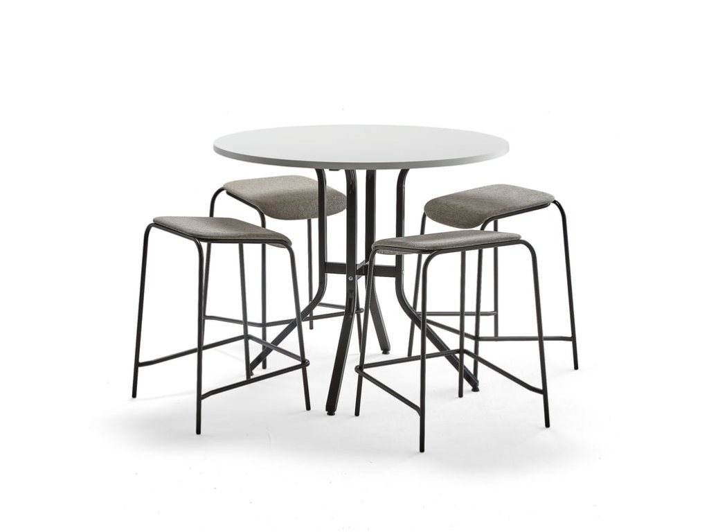 Eine Reihe moderner Möbel mit einem Tisch und höheren Stühlen, entworfen von den Designern von AJ Produkty. Das Set eignet sich für kleinere Besprechungsräume oder Esszimmer. Es besteht aus vier höheren Stühlen mit leicht geneigter Sitzfläche für ergonomisches Sitzen und einem Tisch mit einer strapazierfähigen Laminatplatte. Die höheren Stühle und der Tisch in diesem Set wurden von den Designern von AJ Produkty entworfen. Diese Möbel bieten Ihnen optisch und funktional mehr. Die mittelhohen Stühle und der Tisch ermöglichen sowohl Sitzen als auch Stehen und sind daher sehr praktisch und vielseitig. Das Set ist ideal für kleinere Besprechungsräume und Esszimmer. Der moderne und stilvolle Tisch VARIOUS verfügt über eine solide Stahlkonstruktion. Die Tischplatte besteht aus Laminat, das resistent gegen Kratzer, Schmutz und Flüssigkeiten ist. Es ist sehr leicht sauber zu halten. Den Schmutz können Sie ganz einfach mit einem feuchten Tuch abwischen. Der Tisch eignet sich für verschiedene Umgebungen. ATTEND ist ein mittelhoher, geschmackvoller und stapelbarer Stuhl mit leicht abgesenkter Sitzfläche, um eine ergonomische Sitzposition zu erreichen. Der Sitz ist mit einem Textilbezug aus Naturwolle und Leinentextilfasern mit Ecolabel-Zertifikat gepolstert. Die Fußstützen befinden sich an drei Seiten des Stuhls und sorgen für Komfort und Unterstützung für Ihre Beine und Ihren Rücken.Seien Sie der Erste, der einen Beitrag über diesen Artikel schreibt.