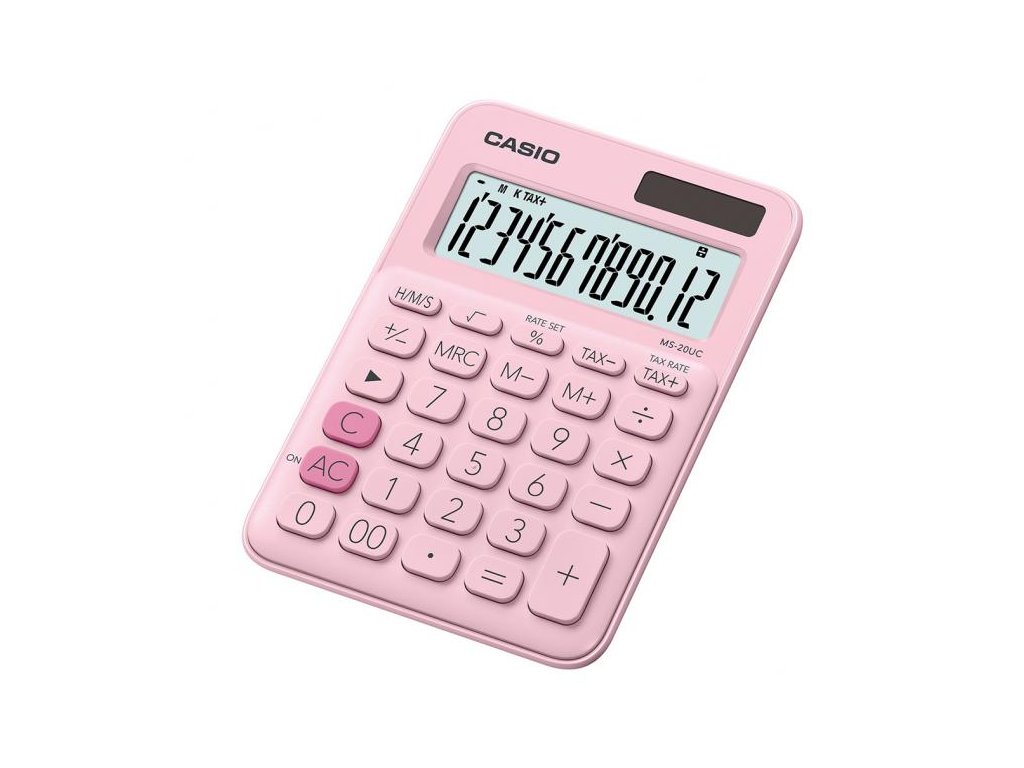Tischrechner mit großem 12-stelligen LCD-Display. Farbe rosa.Technische Spezifikation
