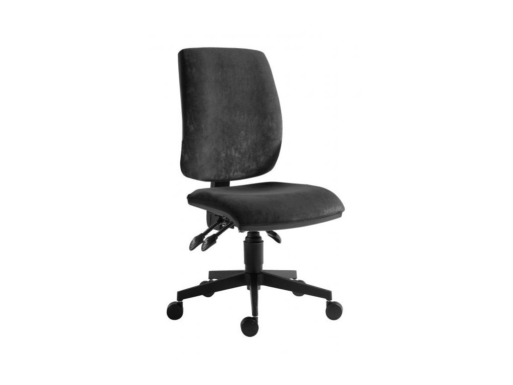Armlehnenloser Bürostuhl mit hoher quadratischer Rückenlehne mit Asynchronmechanik.