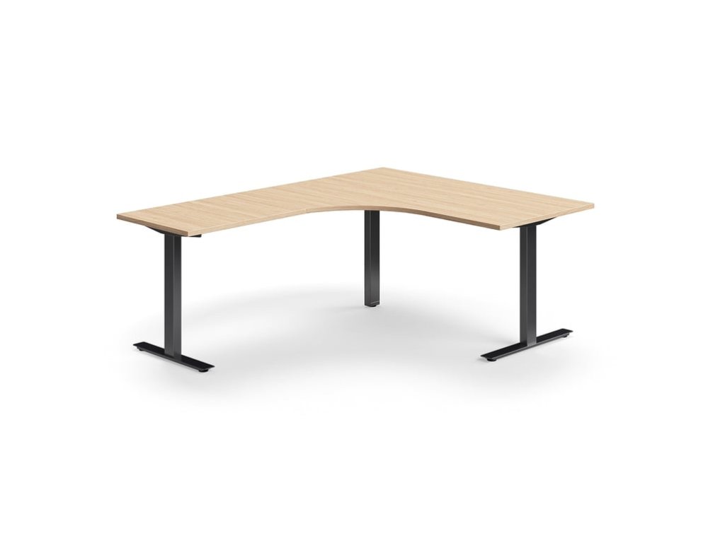 QBUS-Büroschreibtisch, Ecke, 1600 x 2000 mm, T-Gestell, schwarzer Rahmen, Eiche