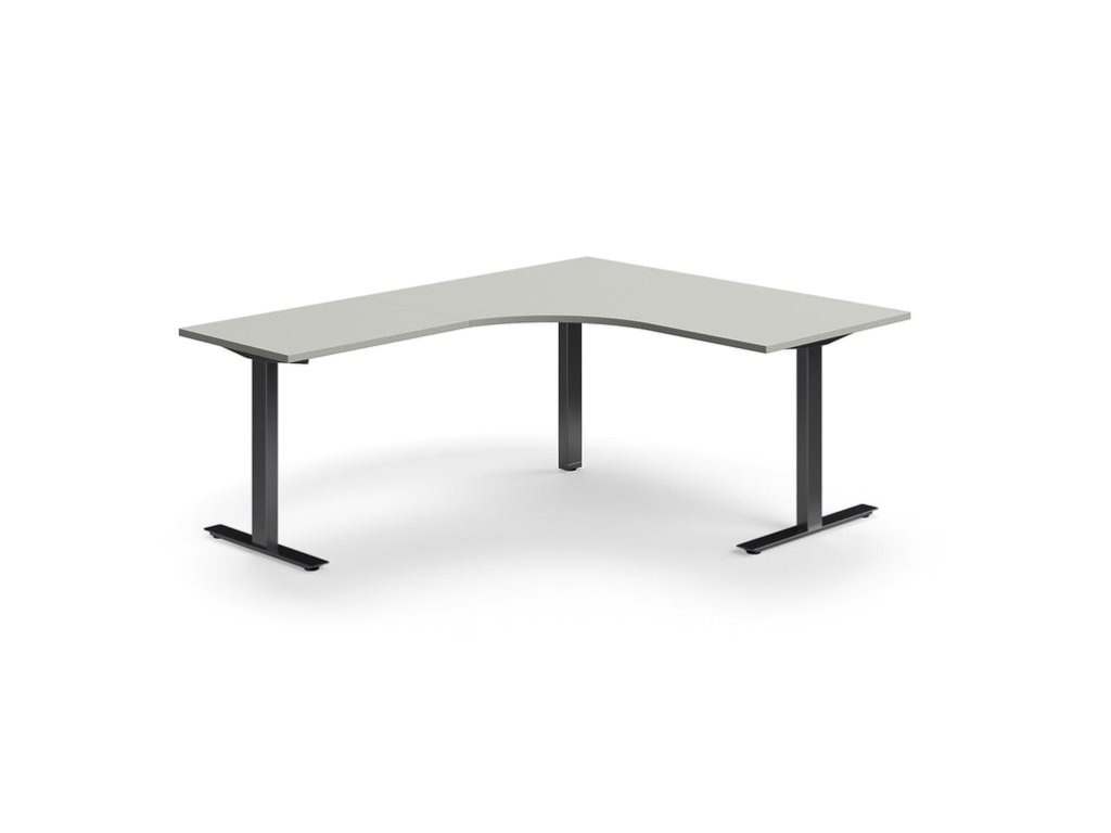 QBUS-Büroschreibtisch, Ecke, 1600 x 2000 mm, T-Gestell, schwarzes Gestell, hellgrau