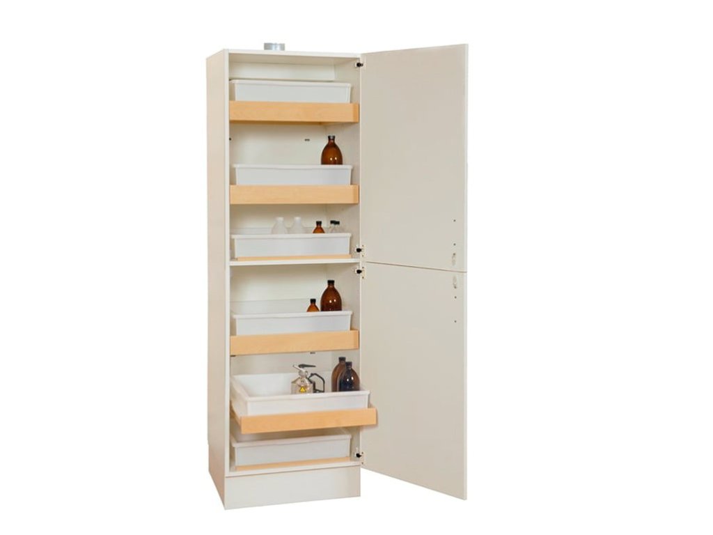 Ein Chemikalienschrank mit zwei Fächern, der die getrennte Lagerung von Basen und Säuren ermöglicht. Es enthält drei Kunststoffbehälter und zwei ausziehbare Regale pro Ordner. Der Schrank verfügt über eine ausreichende Belüftung. Dieser Chemikalienschrank ist für den Einsatz in Schulen, Labors und anderen anspruchsvollen Umgebungen konzipiert. Da der Schrank in zwei Abschnitte mit separaten Türen für jeden Abschnitt unterteilt ist, ist es einfach, Basen und Säuren getrennt aufzubewahren. Ausziehbare Regale erleichtern Ihnen den Überblick über den Inhalt des Schranks und den Zugriff auf alles, was Sie brauchen. Die mit dem Schrank gelieferten Kunststoffbehälter erleichtern die Lagerung und verhindern, dass etwas auf die Regale gelangt. Der Chemikalienschrank besteht aus gehärtetem, starkem Hochdrucklaminat und verfügt standardmäßig über eine rechts angeschlagene Tür. Wichtig: Vergessen Sie nicht, die Ätzmittel unterhalb der Augenhöhe zu platzieren!Seien Sie der Erste, der einen Beitrag über diesen Artikel schreibt.