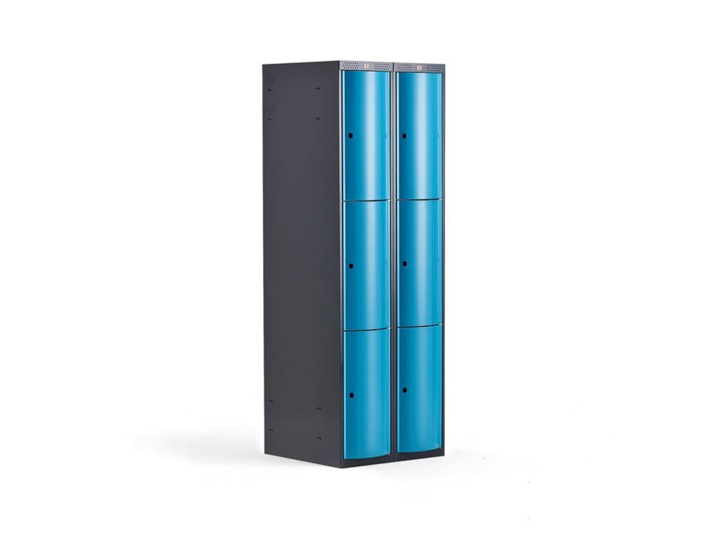 Zweiteiliger Kleiderschrank mit je drei konvexen Türen. Die Belüftungslöcher befinden sich im Ober- und Unterteil. Jedes Fach verfügt über eine Kleiderstange mit zwei Haken, einen Türstopper und Füße. Es kommt ohne Schloss. Diese einzigartigen und eleganten Kleiderschränke sind stilvoll, funktional und für jede Umgebung geeignet. Konvexe Türen mit Metalloberfläche verleihen den Schränken ein modernes und stilvolles Aussehen, das nicht nur für den Empfang, sondern auch für das Ankleidezimmer ideal ist. Schränke bieten Ihnen effiziente Aufbewahrung auf kleinem Raum. Sie sind ideal für mehrere Benutzer in Räumen mit begrenztem Platzangebot. Sie eignen sich für Umkleideräume für Mitarbeiter, private Fitnessstudios und Sportzentren. Sie können sie sogar im Eingangsbereich platzieren und so den Besuchern einen Platz zum Aufhängen von Kleidung und zur Aufbewahrung von Wertgegenständen bieten. Diese Kleiderschränke sind gut ausgestattet und verfügen über alles, was Sie für eine intelligente Aufbewahrungslösung benötigen. Das kleine Fach an der Innenseite der Tür eignet sich ideal zur Aufbewahrung von Hygieneartikeln, Schlüsseln, Handy, Geldbörse und anderen Dingen. Öffnungen an der Unter- und Oberseite des Rahmens sorgen für eine hervorragende Belüftung. Sie bestehen aus vollverschweißtem Stahl mit einer Dicke von 0,7 mm. Konvexe Türen mit Gummianschlägen verleihen ihnen ein echtes Qualitätsgefühl. Ergänzen Sie die Schränke mit passendem Zubehör und schaffen Sie einen Stauraum ganz nach Ihren Bedürfnissen. Wählen Sie aus verschiedenen Schlössern, Beinen und anderem praktischen Zubehör. Alle Zubehörteile sind separat erhältlich.Seien Sie der Erste, der einen Beitrag über diesen Artikel schreibt.
