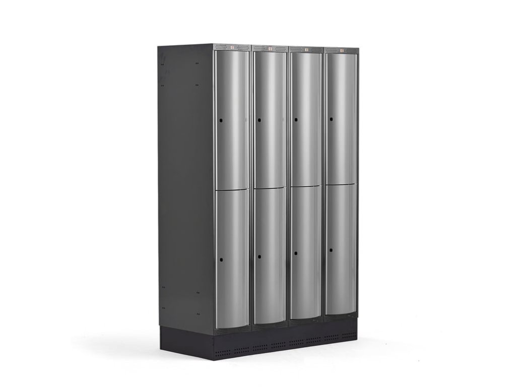 Aufbewahrungsschrank mit konvexer Tür und Sockel. Jeder Ordner verfügt über eine Aufhängestange mit zwei Doppelhaken, einen Öffnungsbegrenzer und einen Ordner an der Tür. Belüftungslöcher im oberen und unteren Teil. Schlösser sind separat zu bestellen. Elegante Schränke mit ihrem einzigartigen Design verleihen jedem Interieur Stil. Konvexe Türen in Metallic-Farben wirken modern und eignen sich für Eingangsbereiche und Garderoben. Sie sind ideal für mehrere Benutzer in Räumen mit begrenztem Platzangebot. Sie eignen sich für Umkleideräume für Mitarbeiter, private Fitnessstudios und Sportzentren. Sie können sie sogar im Eingangsbereich platzieren und so den Besuchern einen Platz zum Aufhängen von Kleidung und zur Aufbewahrung von Wertgegenständen bieten. Sie können in den Eingangsbereichen platziert werden und ermöglichen den Besuchern so eine einfache und schnelle Aufbewahrung ihrer Kleidung. Die Kleiderschränke sind gut ausgestattet und bieten alles, was Sie von Kleiderschränken erwarten. Der Ordner an der Tür eignet sich besonders zur Aufbewahrung von Kleinigkeiten, z.B. Toilettenartikel und Schlüssel. Die Belüftungslöcher im oberen und unteren Teil des Skeletts tragen zur ordnungsgemäßen Luftzirkulation und zum Abtransport von Feuchtigkeit bei. Die Schränke verfügen über ein vollverschweißtes Stahlskelett mit einer Stärke von 0,7 mm. Konvex geformte Türen verfügen über Gummistopper für geräuschloses Schließen. Die Schränke werden inklusive praktischem Sockel aus schwarzem Stahlblech geliefert. Der Sockel erleichtert die Reinigung und verhindert, dass Gegenstände unter den Schrank fallen. Es verhindert die Bildung von Staub und Schmutz unter dem Schrank. Schlösser werden separat bestellt. Wählen Sie den Typ, der Ihren Anforderungen entspricht.Seien Sie der Erste, der einen Beitrag über diesen Artikel schreibt.