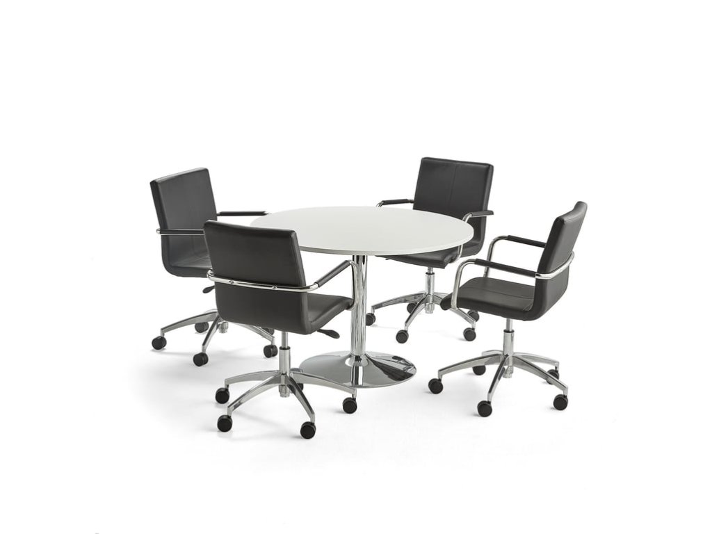 Ein praktisches Set aus bequemen und stilvollen Möbeln! Die Stühle sind höhenverstellbar und auch die Armlehnen tragen zu einem hohen Sitzkomfort bei. Der Tisch besteht aus einer langlebigen Laminatplatte mit einem Durchmesser von 1100 mm. Es ist leicht zu reinigen. Komfort ist die Basis für den Erfolg aller Meetings! Unsere klassischen runden Lily-Tische und eleganten Delta-Stühle bilden zusammen den perfekten Rahmen für kleinere Besprechungen. Dank des runden Tisches können Sie besseren Kontakt zu Ihren Partnern halten, die Drehfunktion der Stühle und die Möglichkeit der Bewegung auf Rollen erleichtern das Verhandeln von Angesicht zu Angesicht, ohne den ganzen Körper drehen zu müssen. Delta-Stühle sind bequem und stilvoll. Sie sind mit Kunstleder gepolstert. Dank der Höhenverstellung lassen sich die Stühle ganz einfach anpassen, sodass Sie bequem sitzen und die Position den ergonomischen Empfehlungen entspricht. Teil des Chromkreuzes sind fünf feste Rollen, die eine einfache Bewegung des Stuhls ermöglichen. Der solide Lily-Tisch verfügt über ein Untergestell mit runder Basis und eine strapazierfähige Oberfläche, die leicht zu reinigen ist. Es bietet bequem Platz für vier Personen.Seien Sie der Erste, der einen Beitrag über diesen Artikel schreibt.
