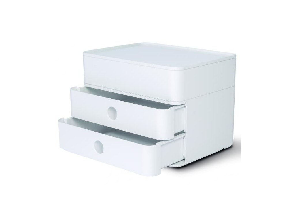 Die moderne Schubladenbox im stilvollen Design mit durchdachten Details ist inspiriert von Flexibilität und einem modernen Lebensstil. Es umfasst ein Ablagefach mit Deckel und abnehmbarer Schüssel sowie 2 geschlossene Schubladen mit Trennwänden und einem intelligenten Kabelloch. Der Deckel kann als Serviertablett verwendet werden. Abmessungen (B × H × T) 260 × 195 × 190 mm. Farbe weiß.Zusätzliche Parameter