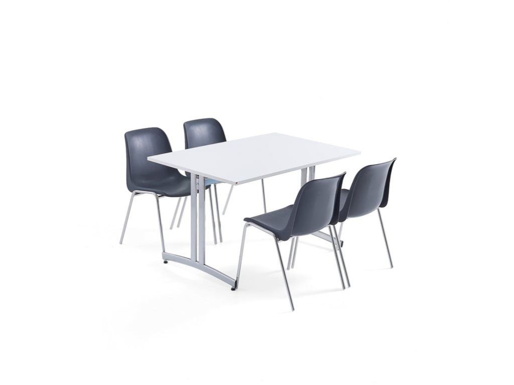 Das Möbelset besteht aus einem soliden Tisch mit rechteckiger Laminatplatte und stapelbaren Stühlen mit einteilig geformter Sitzfläche und Rückenlehne. Langlebige Möbel, die leicht zu reinigen sind. Ideal für Esszimmer oder Lounges. Ein praktisches Möbelset für Toiletten, Esszimmer oder andere Umgebungen, in denen Tische und Stühle benötigt werden, die langlebig und leicht sauber zu halten sind. Die Möbel haben ein modernes Design und lassen sich problemlos mit anderen Möbeln kombinieren. Der Tisch verfügt über ein sehr stabiles T-Gestell aus einer flachen Ovalrohrkonstruktion. Der Rahmen ist unten abgerundet, was die Reinigung unter und um den Tisch herum erleichtert. Die Ausgleichsfüße ermöglichen die Nivellierung des Tisches bei Bodenunebenheiten. Die Tischplatte lässt sich leicht abwischen und hält auch anspruchsvolleren Einsatzbedingungen stand. Die einteiligen Stühle bestehen aus geformtem Kunststoff, wodurch sie robust und leicht zu reinigen sind. Die schlanken Stahlrohrbeine bilden einen attraktiven Kontrast zur Sitzfläche. Die Stühle sind stapelbar, was ihre Lagerung und Bodenreinigung erleichtert.Seien Sie der Erste, der einen Beitrag über diesen Artikel schreibt.