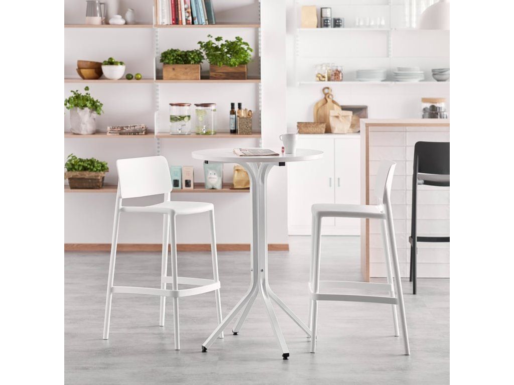 A small furniture set consisting of a stylish high table and two bar stools. You can place it in the hallway or in the relaxation area and you will see that it will be popular! It invites to a spontaneous meeting of colleagues and a coffee break. The chairs are stackable, the table top is made of durable laminate. A smart set of furniture suitable for a short rest or a snack. It doesn't take up much space! You can complement the white table with distinctive chairs or stay with a monochromatic look. The Various table was designed by the designers of AJ Produkty. It is a solid and modern table with a stable steel structure. The laminated surface of the table top is highly resistant to water and scratches. It is very easy to clean, just wipe with a damp cloth. The Rio bar stool is made of one piece of polypropylene reinforced with glass fiber, which is resistant to UV radiation. The seat and backrest have a gentle slope that gives you a comfortable sitting position. The chair is stackable, which facilitates cleaning, transport and storage. The chair includes a fixed footrest for greater comfort.Be the first who will post an article to this item!