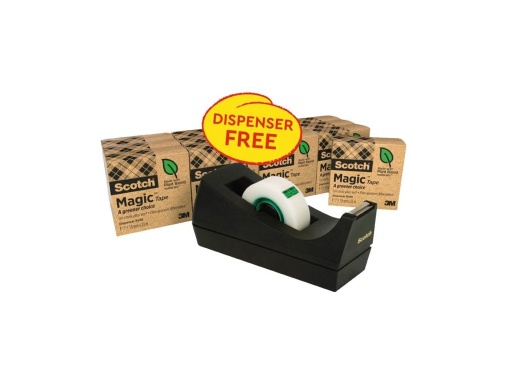 Kedvezményes csomag, 14 db Scotch® Magic™ 900 természetes szálú szalag, 19 mm x 33 m méretű, 100%-ban újrahasznosított műanyagból készült asztali tálcával, ingyenesen. A papír csomagolás és a szalag tubusa 100%-ban újrahasznosított kartonból készül, amely 100%-ban újrahasznosítható. Vízbázisú ragasztó, minimális oldószertartalom.Méretek: 19 mm x 33 m