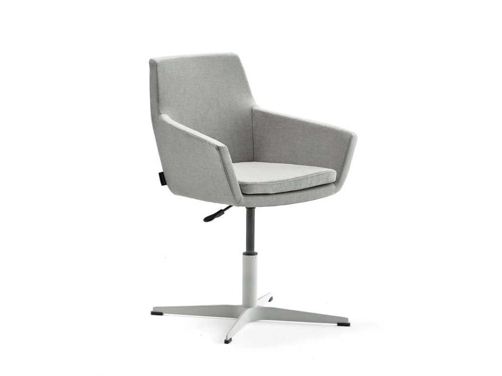 A conference chair with a tasteful, compact design that, despite the small demands on space, does not reduce comfort. The chair has a rotating stand and the height can be adjusted using a gas piston. In addition to conference rooms, it is also excellent for receptions, lounges and offices. It is ideal for use in business lounges and offices as well as conference rooms. The minimalist conference chair in the Scandinavian style is a combination of simplicity, comfort and a feeling of luxury. The stylish design ensures that it fits perfectly into most environments, from lounges to meeting rooms. The rotating base gives the sitter freedom of movement. The chair has a durable fabric cover available in several colors. The FAIRFIELD armchair can be easily combined with our other office and conference furniture, e.g. Lancaster chair, which comes in the same colors. The slim cross is made of durable aluminum. The height of the seat is adjustable using a gas piston.Be the first who will post an article to this item!