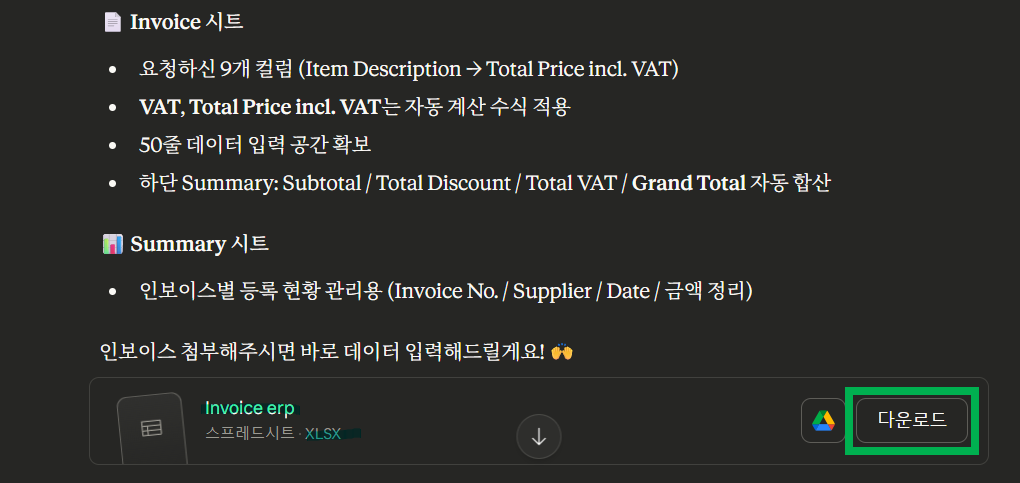 7. If you run the command with additional invoice attachments, you can download the organized Excel data as shown below.