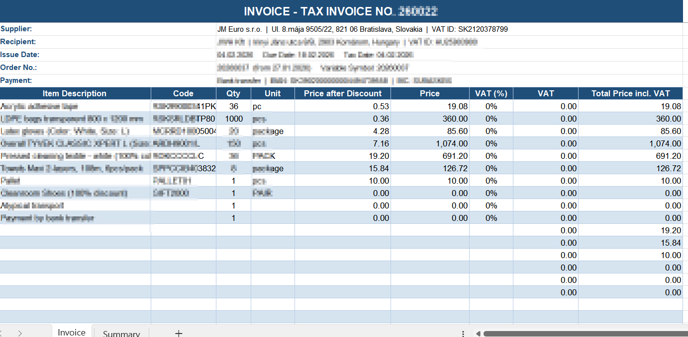 "Please create an Excel XLSX file of the invoice data I am attaching now so that I can register it in the ERP system. Please arrange the order as follows: Item Description, Code, Qty, Unit, Price after discount, Price, VAT(%), VAT, Total Price incl. VAT, and Summary. I will send you the invoices one by one. "