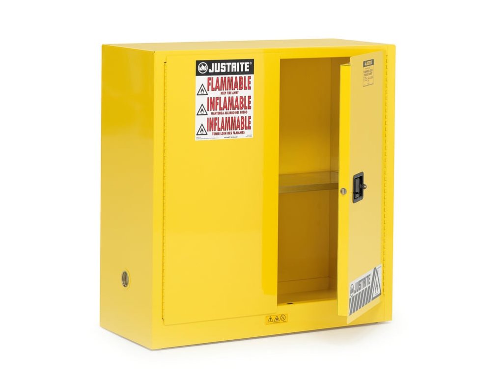 Safety cabinet tested and approved by FM (Factory Mutual) for safe storage of combustibles and chemicals. The cabinet includes a security three-point lock (including two keys) and an impermeable sump. Protect employees and reduce the risk of fire by storing flammable liquids and chemicals in these lockable safety metal cabinets. Cabinets are tested and approved by FM (Factory Mutual) against fire. They have double walls of thick welded steel with 38 mm insulating air space for better fire resistance. The door closes manually and is equipped with a safety three-point lock. You can also add a padlock for added security. Fire-resistant cabinets are equipped with adjustable shelves, reflective warning labels and double vents with fire fuses. The catch basin with a height of 51 mm catches any liquid spills.Be the first who will post an article to this item!