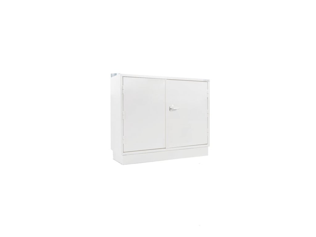 Euroclass A1 lockable metal chemical cabinet with fireproof insulation between double steel plates in the door, sides, top and bottom. The cabinet is surface treated with fire-resistant powder paint. It is equipped with ventilation, a removable front panel that covers the cabinet legs and shelves with raised edges and sealed corners. The ventilation system of this fireproof chemical cabinet has been tested by the Swedish Research Institute SP. On the left side of the cabinet is a ventilation pipe with adjustable openings in the upper and lower parts. Between these holes, the pipe is perforated, which means that the space between all the shelves is ventilated. The metal cabinet is tested for stability, strength, construction and surface resistance. The external fire resistance of the cabinet has been tested by the Swedish Research Institute SP. It has fireproof insulation (insulation material in accordance with the Euroclass A1 standard) between double steel plates in the doors, sides, top and bottom. The entire cabinet is finished with a fire-resistant powder coating. This fireproof chemical cabinet comes with an electronic lock. The cabinet includes one adjustable shelf, thanks to which you can easily adapt the interior of the cabinet to your needs. Raised edges and sealed shelf corners prevent liquids from leaking. If you plan to store larger containers, you can add a catch basin that you place on the bottom of the cabinet (available as an accessory). The cabinet can be supplemented with additional shelves.Be the first who will post an article to this item!