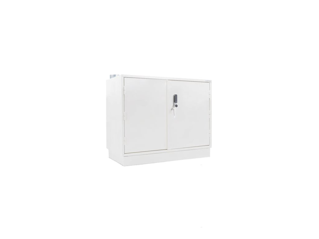 Euroclass A1 lockable metal chemical cabinet with fireproof insulation between double steel plates in the door, sides, top and bottom. The cabinet is surface treated with fire-resistant powder paint. It is equipped with ventilation, a removable front panel that covers the cabinet legs and shelves with raised edges and sealed corners. The ventilation system of this fireproof chemical cabinet has been tested by the Swedish Research Institute SP. On the left side of the cabinet is a ventilation pipe with adjustable openings in the upper and lower parts. Between these holes, the pipe is perforated, which means that the space between all the shelves is ventilated. The metal cabinet is tested for stability, strength, construction and surface resistance. The external fire resistance of the cabinet has been tested by the Swedish Research Institute SP. It has fireproof insulation (insulation material in accordance with the Euroclass A1 standard) between double steel plates in the doors, sides, top and bottom. The entire cabinet is finished with a fire-resistant powder coating. This fireproof chemical cabinet comes with an electronic lock. The cabinet includes one adjustable shelf, thanks to which you can easily adapt the interior of the cabinet to your needs. Raised edges and sealed shelf corners prevent liquids from leaking. If you plan to store larger containers, you can add a catch basin that you place on the bottom of the cabinet (available as an accessory). The cabinet can be supplemented with additional shelves.Be the first who will post an article to this item!