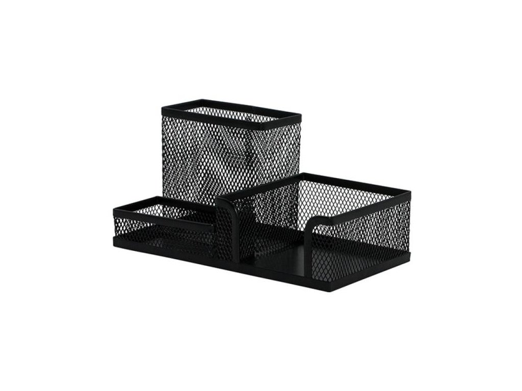Kombinowany stojak na ołówki i długopisy, wizytówki, kostkę papierową i bibeloty biurowe (szpilki, spinacze, spinacze, gumki itp.) w wykończeniu drucianym. Wymiary (szer.×wys.×gł.) 205×103×98 mm.Kolor: czarny.