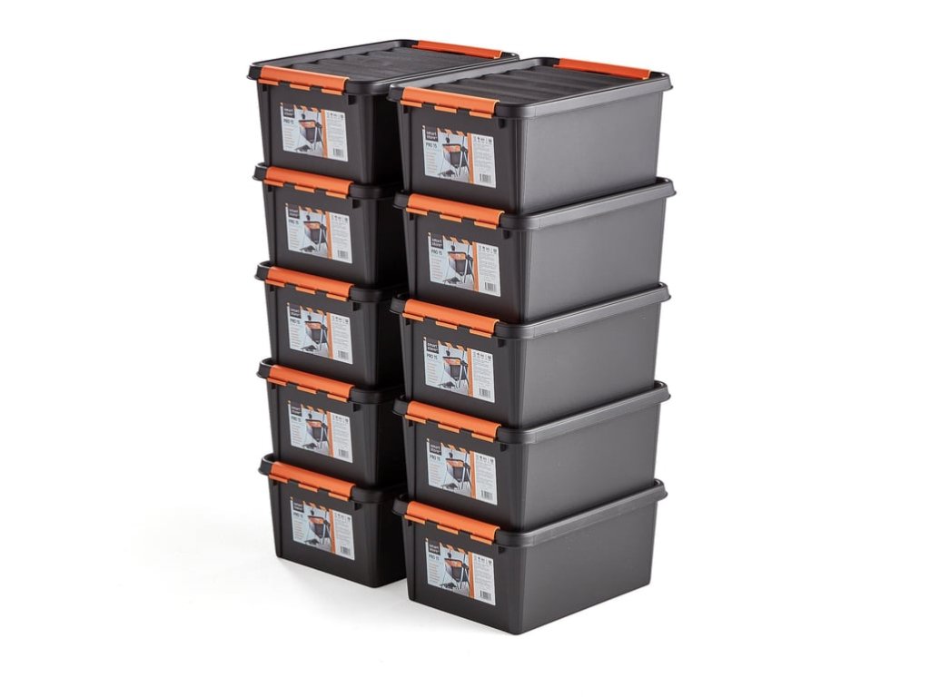 Robust plastic boxes with hinged lids. The pay boxes are stackable, approved for use in the food industry and withstand temperatures from -40°C to +120°C. These plastic boxes with lids are durable and can withstand rough handling. Robust plastic boxes approved for use in the food industry. They are made of polypropylene and can withstand rough handling. They withstand temperatures from -40°C to +120°C, so they are suitable for a variety of purposes. You can store tools in workshops and food in refrigerators in them. A durable lid with a non-slip surface allows for safe stacking. The individual boxes fit into each other, which saves space and enables more efficient storage. The handles on the shorter sides of the boxes also serve to close the lid. For easier recognition, the handles are in a contrasting orange color (boxes and lids are black). You can achieve clearer storage by supplementing the boxes with practical organizers.Be the first who will post an article to this item!