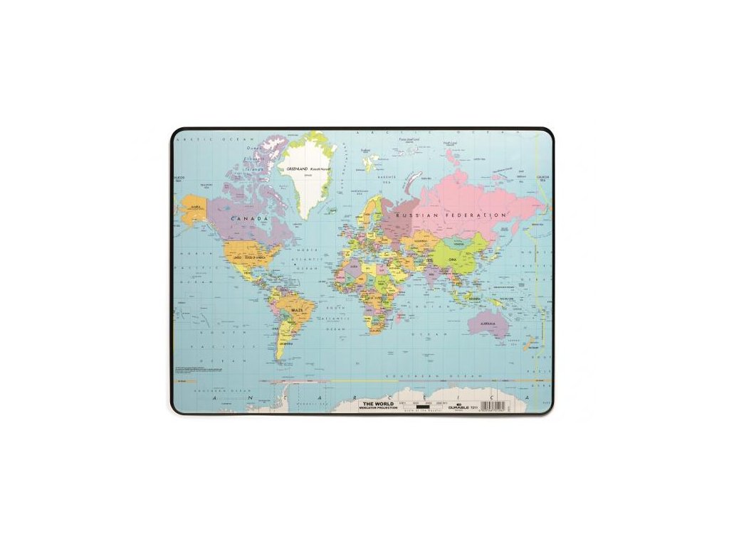 Weltkarte unter einer versiegelten Klarsichthülle. Text in der englischen Version.Abmessungen: 40 x 53 cm