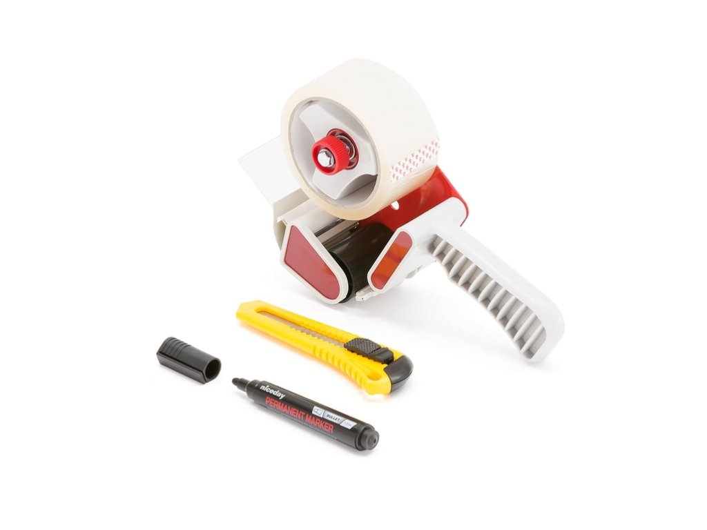 Set for packing goods (adhesive tape holder, tape, knife, marker)