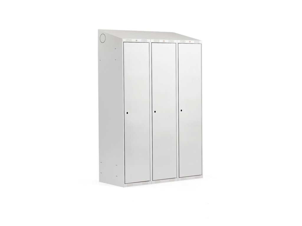 Robust 2-section wardrobe with shelf, wardrobe rod with 2 hooks, slanted top and ventilation holes. With preliminary preparation for connection to the ventilation system. Door with opening limiter and rubber stops. Optional different bases and rich accessories. Supplied without lock High quality wardrobe with fully welded steel construction. The surface treatment ensures the resistance of the surface against scratches and the long service life of the material even in more demanding conditions. The sloping top prevents the accumulation of dust and thus facilitates cleaning. The ventilation holes in the upper and lower parts of the cabinet help with proper air circulation and remove moisture. In the wall of the skeleton there is a preparation that allows connection to a ventilation system with Ø 100 mm. Improved door opening stop and rubber stops ensure quiet opening and closing. They are perfect for storing clothes and personal items at workplaces, schools, sports facilities, etc. We deliver the wardrobe with basic interior equipment, a shelf and a wardrobe rod with 2 hooks. Thanks to the rich accessories, you can equip the cabinet exactly according to your needs and ideas! We deliver the cabinet without a lock and you can choose the one that suits you best. A cylinder lock is useful when only one person uses the cabinet. A combination lock or twist lock is a great choice when users are at risk of losing their keys. A padlock can also be used with the twist cap, which we recommend if several people use the cabinet, e.g. in gyms or swimming pools. A lock with a numerical code is ideal when several people need to have access to one cabinet. This is especially practical when it is used for work rather than personal items. Cabinets can be equipped with different types of bases. Thanks to the plinth, people won't forget anything under the cabinets. The legs make it easier to clean the floor under them, which is suitable for environments demanding hygiene. You will appreciate the bench without or with a shoe rack especially when changing shoes in the dressing room. You can add a towel holder to the inside of the door and dividers to separate clean and dirty clothes.Be the first who will post an article to this item!