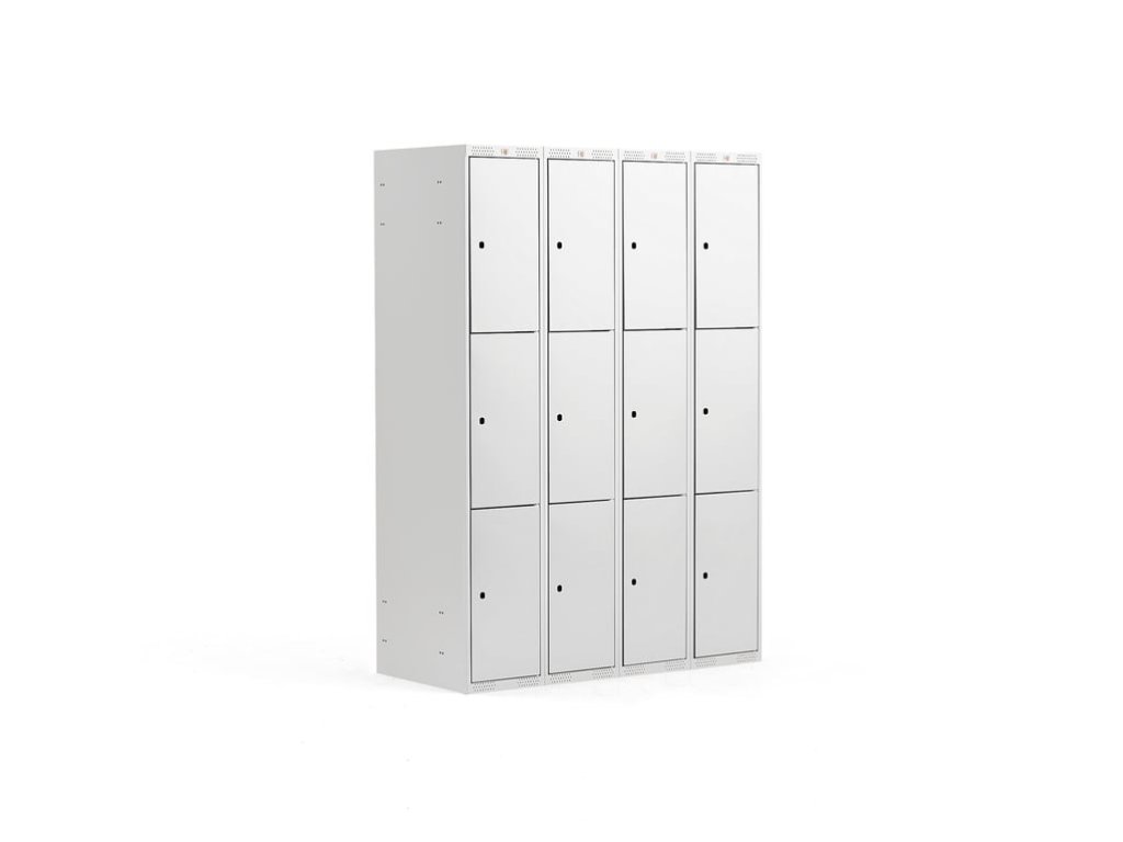 Cabinets with compartments with reinforced doors with rubber dampers and hinged hinges. They have ventilation holes in the upper and lower part. Cabinets can be supplemented with various bases. They come without locks. Cabinets with compartments are made of high-quality steel sheet with powder coating. Surface treatment with powder coating ensures scratch resistance during more demanding daily use. The frame and door are made of sheet steel with a thickness of 0.7 mm and 0.8 mm. These lockers are ideal for storing personal belongings in workplaces, gyms, schools, exhibitions and other public spaces. Reinforced doors have rubber stoppers for smooth and quiet closing. Ventilation holes in the lower and upper part of the frame allow moisture and odors to be vented. Choose from a variety of accessories and combine multiple cabinets as needed to create a suitable solution for storing personal belongings. Storage lockers with compartments are supplied without locks, allowing you to choose the locking system that best suits your requirements. If only one person will use the cabinet, a cylinder lock is suitable. If you are concerned that staff or students may lose their keys, a padlock or combination lock is an excellent choice. The optional padlock is attached to the buckle. This option is recommended if the lockers are used by multiple users, such as in a fitness center or swimming pool. If many people need access to a locked space, a combination lock can be a good solution. This is especially useful if the lockers are used in the workplace and not for storing personal items. Cabinets can also be equipped with different types of bases. The base frame helps prevent people from leaving things under the cabinets. The legs raise the entire cabinet above the floor and make cleaning easier. This is especially practical in an environment where hygiene is important. A stand with a bench with or without shoe storage is practical in dressing rooms.Be the first who will post an article to this item!