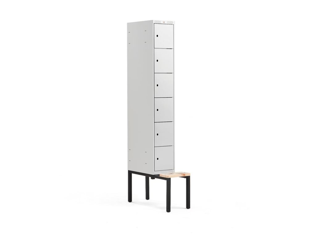 The storage cabinet for personal belongings is equipped with a frame on legs with a bench. Reinforced doors with rubber dampers. Ventilation holes in the upper and lower part. The cabinets are made of solid steel sheets that are powder coated. Surface treatment with powder coating ensures scratch resistance during more demanding daily use. The frame and door are made of sheet steel with a thickness of 0.7 mm and 0.8 mm. Reinforced doors have rubber stoppers for smooth and quiet closing. Ventilation holes in the lower and upper part of the frame allow moisture and odors to be vented. Metal lockers are ideal for storing personal belongings in workplaces, gyms, schools, exhibition spaces and other public spaces. The cabinet is supplied together with a practical frame on legs with a bench, the frame is made of fully welded black powder-coated steel, a lacquered pine bench and rectification legs. Adding a frame on legs with a bench raises the cabinet to a suitable height for sitting and also makes it easier to clean underneath for better hygiene. Choose from a variety of accessories and combine multiple units as needed to create a suitable solution for storing personal belongings. Metal cabinets are supplied without locks, allowing you to choose the lock system that best suits your requirements.Be the first who will post an article to this item!