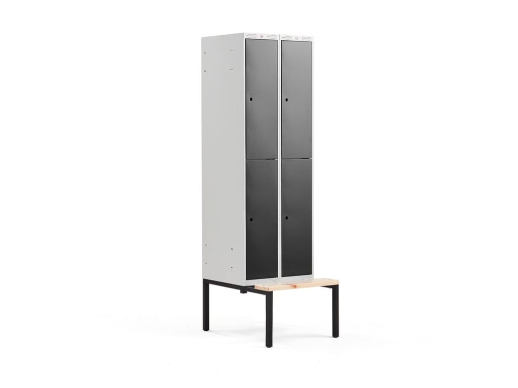 The storage cabinets are equipped with a common frame on legs with a bench, a hanging rod in each compartment and reinforced doors with rubber stops. Ventilation holes in the upper and lower part. Supplied without locks. The cabinets are made of solid steel sheets that are powder coated. Surface treatment with powder coating ensures scratch resistance during more demanding daily use. The frame and door are made of sheet steel with a thickness of 0.7 mm and 0.8 mm. Metal lockers are ideal for storing personal belongings in workplaces, gyms, schools, exhibition spaces and other public spaces. Reinforced doors have rubber stoppers for smooth and quiet closing. Ventilation holes in the lower and upper part of the frame allow moisture and odors to be vented. The wardrobe comes with a rail with two hooks and hanging straps for convenient storage of clothes. The cabinet is supplied together with a practical frame on legs with a bench, the frame is made of fully welded black powder-coated steel, a lacquered pine bench and rectification legs. Adding a frame on legs with a bench raises the cabinet to a suitable height for sitting and also makes it easier to clean underneath for better hygiene. Choose from a variety of accessories and combine multiple units as needed to create a suitable solution for storing personal belongings. Metal cabinets are supplied without locks, allowing you to choose the lock system that best suits your requirements.Be the first who will post an article to this item!