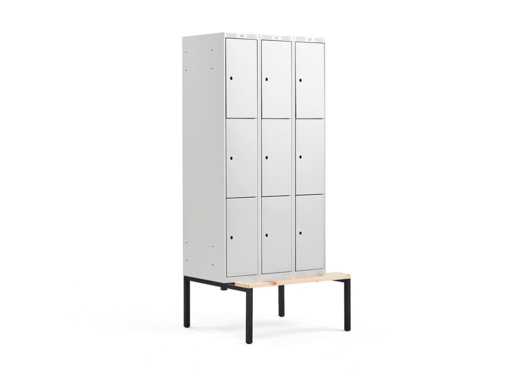 Storage cabinet for personal belongings, with a frame on legs with a bench and reinforced doors with rubber dampers. Ventilation holes in the upper and lower part. Supplied without locks. These storage cabinets are made of solid powder-coated sheet steel. Surface treatment with powder coating ensures scratch resistance during more demanding daily use. The frame and door are made of sheet steel with a thickness of 0.7 mm and 0.8 mm. Reinforced doors have rubber stoppers for smooth and quiet closing. Ventilation holes in the lower and upper part of the frame allow moisture and odors to be vented. These lockers are ideal for storing personal belongings in workplaces, gyms, schools, exhibition spaces and other public spaces. The cabinets are supplied together with a practical frame on legs with a bench, the frame is in all-welded, black, powder-coated steel with a lacquered pine bench and rectification legs. The frame on legs with a bench raises the storage cabinet to a suitable height, and also facilitates cleaning under the cabinet for better hygiene. Choose from various accessories and combine several cabinets as needed to create a suitable solution for storing personal belongings. The storage lockers are supplied without locks, allowing you to choose the locking system that best suits your requirements.Be the first who will post an article to this item!