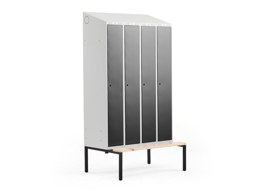Wardrobe with ventilation holes, slanted canopy, storage shelf and rod with two hanging hooks. Ready for installation of the ventilation system. Door with stop for opening 90° and rubber shock absorbers. Comes with a frame on legs with a bench. Locks are sold separately (see accessories). High-quality cabinets offer many customization options. The cabinets are made of solid, fully welded steel sheets that are powder coated. The roofs of the cabinets are slanted to prevent the accumulation of dust or forgotten items on the roofs of the cabinets. The door has rubber stoppers for smooth and quiet closing. Ventilation holes in the lower and upper part of the frame ventilate moisture and odors. The metal cabinets are ready for connection to the external ventilation system (Ø 100 mm), which enables air circulation in them. Use lockers to store clothes and personal belongings in workplaces, gyms, schools, etc. The wardrobes come with accessories for storing clothes, a shelf for storage and a rod with two hooks for hanging. The cabinet is supplied together with a practical frame on legs with a bench, the frame is made of fully welded black powder-coated steel, a lacquered pine bench and rectification legs. Adding a frame on legs with a bench raises the cabinet to a suitable height for sitting and also makes it easier to clean underneath for better hygiene. Add accessories to the cabinets and customize the cabinet according to your needs. Choose from several different types of locks and accessories. All accessories are sold separately.Be the first who will post an article to this item!