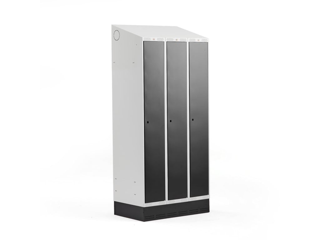 A wardrobe with ventilation holes, a sloping roof, a shelf for storage and a rod with two hooks for hanging. Ready for installation of the ventilation system. Door with stop for opening 90° and rubber shock absorbers. The cabinet is equipped with a plinth base. Locks are sold separately (see accessories). High-quality cabinets offer many customization options. The cabinets are made of solid, fully welded steel sheets that are powder coated. The roofs of the cabinets are slanted to prevent the accumulation of dust or forgotten items on the roofs of the cabinets. The door has rubber stoppers for smooth and quiet closing. Ventilation holes in the lower and upper part of the frame ventilate moisture and odors. The metal cabinets are ready for connection to the external ventilation system (Ø 100 mm), which enables air circulation in them. Use lockers to store clothes and personal belongings in workplaces, gyms, schools, etc. The wardrobes come with accessories for storing clothes, a shelf for storage and a rod with two hooks for hanging. The cabinet is supplied with a practical plinth made of black powder-coated steel. The base frame raises the cabinet slightly from the floor. It prevents the formation of dust and dirt under the cabinet. Add accessories to the cabinets and customize the cabinet according to your needs. Choose from several different types of locks and accessories. All accessories are sold separately.Be the first who will post an article to this item!