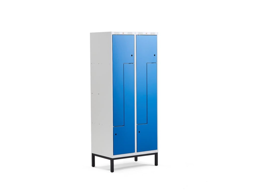 Lockable clothes cabinet with a frame on legs and two compartments in each part. Each compartment has a door stopper, a hook for hanging and ventilation. Comes without locks. Lockable Z cabinets are a great solution for areas with limited space. They are a very good alternative for spaces where there is not enough space for lockers with doors, while offering an equally good solution. These metal lockers are stable, strong and durable. They are an ideal solution for various environments, especially for school and work locker rooms. There is enough space inside to hang clothes and store things like bags or helmets. The frame and door are made of powder-coated sheet steel, which ensures a solid surface resistant to impacts and heavy wear. The frame has an unobtrusive gray color and is well ventilated thanks to perforations in the upper and lower parts. The door is 18 mm thick and consists of two plates that are welded together, making them very stable. Each compartment is equipped with a hook for hanging clothes. The door has a stop that prevents it from opening more than 90˚. Z cabinets are delivered assembled without locks. Choose a suitable locking solution according to your needs. The cabinet comes complete with a practical frame on welded black powder-coated steel legs and rectification feet. The legs hold the cabinet above the floor, which makes cleaning easier. It is a suitable solution especially in environments with high demands on hygiene.Be the first who will post an article to this item!