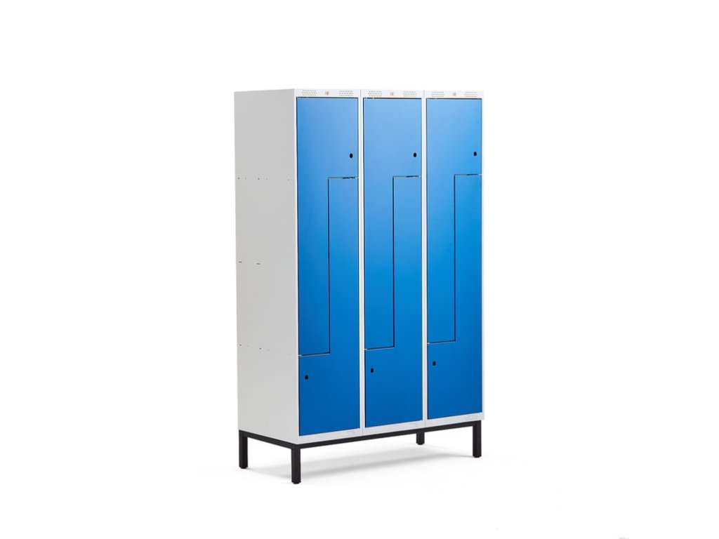 Lockable clothes cabinet with a frame on legs and two compartments in each part. Each compartment has a door stopper, a hook for hanging and ventilation. Comes without locks. Lockable Z cabinets are a great solution for areas with limited space. They are a very good alternative for spaces where there is not enough space for lockers with doors, while offering an equally good solution. These metal lockers are stable, strong and durable. They are an ideal solution for various environments, especially for school and work locker rooms. There is enough space inside to hang clothes and store things like bags or helmets. The frame and door are made of powder-coated sheet steel, which ensures a solid surface resistant to impacts and heavy wear. The frame has an unobtrusive gray color and is well ventilated thanks to perforations in the upper and lower parts. The door is 18 mm thick and consists of two plates that are welded together, making them very stable. Each compartment is equipped with a hook for hanging clothes. The door has a stop that prevents it from opening more than 90˚. Z cabinets are delivered assembled without locks. Choose a suitable locking solution according to your needs. The cabinet comes complete with a practical frame on welded black powder-coated steel legs and rectification feet. The legs hold the cabinet above the floor, which makes cleaning easier. It is a suitable solution especially in environments with high demands on hygiene.Be the first who will post an article to this item!