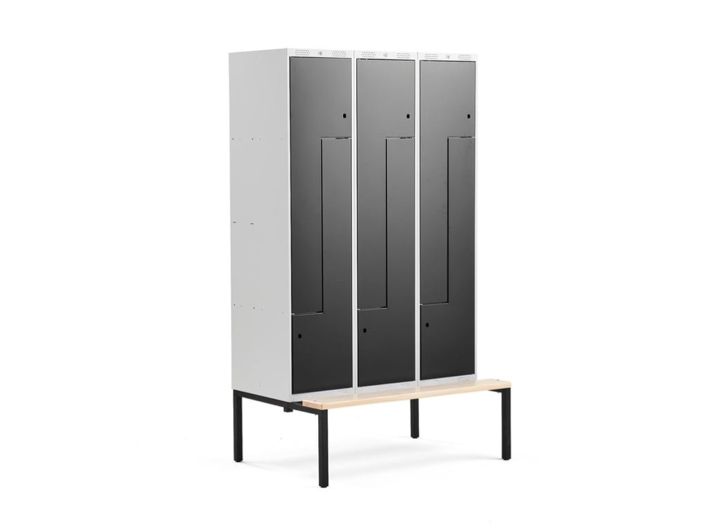 Lockable clothes cabinet with a frame with a bench and two compartments in each part. Each compartment has a door stopper, a hook for hanging and ventilation. Comes without locks. Lockable Z cabinets are a great solution for areas with limited space. They are a very good alternative for spaces where there is not enough space for lockable cabinets with doors, while offering an equally good solution. These metal lockers are stable, strong and durable. They are ideal for various environments, especially for schools and workplace changing rooms. There is enough space inside to hang clothes and store things like bags or helmets. The frame and door are made of powder-coated sheet steel, which ensures a solid surface resistant to impacts and heavy wear. The skeleton has an unobtrusive gray color and is well ventilated thanks to perforations in the upper and lower parts. The door is 18 mm thick and consists of two plates that are welded together, making them very stable. Each compartment is equipped with a hook for hanging clothes. The door has a stop that prevents it from opening more than 90˚. Z cabinets are delivered assembled without locks. Choose a suitable locking solution according to your needs. The lockable cabinet comes with a practical bench frame made of fully welded, powder coated steel. The seat is made of polished pine wood. The frame has adjustable feet. The frame with the bench provides a comfortable sitting height and also facilitates cleaning under the cabinet.Be the first who will post an article to this item!