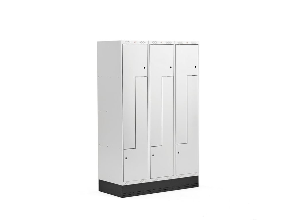 Lockable clothes cabinet with plinth and two compartments in each part. Each compartment has a door stopper, a hook for hanging and ventilation. Comes without locks. Lockable Z cabinets are a great solution for areas with limited space. They are a very good alternative for spaces where there is not enough space for lockers with doors, while offering an equally good solution. These metal lockers are stable, strong and durable. They are ideal for various environments, especially for schools and workplace changing rooms. There is enough space inside to hang clothes and store things like bags or helmets. The frame and door are made of powder-coated sheet steel, which ensures a solid surface resistant to impacts and heavy wear. The frame has an unobtrusive gray color and is well ventilated thanks to perforations in the upper and lower parts. The door is 18 mm thick and consists of two plates that are welded together, making them very stable. Each compartment is equipped with a hook for hanging clothes. The door has a stop that prevents it from opening more than 90˚. Z cabinets are delivered assembled without locks. Choose a suitable locking solution according to your needs. The cabinet comes with a practical plinth that forms the basic frame. The plinth is made of powder-coated sheet steel and holds the cabinet above the floor. The plinth helps prevent the accumulation of dust and dirt. It prevents things from falling under the cabinet, thus reducing the risk of losing personal belongings.Be the first who will post an article to this item!