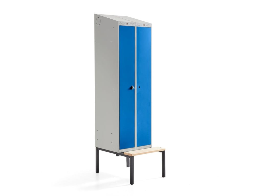 Cabinet with bench, hat shelf and clothes rail with two clothes hooks. The doors have stoppers, rubber pads and towel hooks. Perforations for ventilation. The lock is sold separately. A wardrobe with two doors with a common latch, which can have a central lock. The design allows separate storage, for example dirty and clean or dry and wet clothes. The cabinet has a solid construction that can withstand demanding conditions. It has a durable powder coating. The door stop stops the door opening at an angle greater than 90˚ and the rubber pads ensure silent closing. The metal cabinet is intended for efficient storage of clothes, towels, etc. It is ready to connect an external ventilation system through a hole (Ø 100 mm) on the side. There is also ventilation in the form of perforations in the lower and upper part. Perforations guarantee the flow of fresh air. The cabinet has a beveled upper part for a more hygienic and easy-to-wash environment. The cabinet comes with a practical frame with a bench made of fully welded, powder-coated steel. The seat is made of polished pine wood. The frame has adjustable feet. The frame with the bench provides a comfortable sitting height and also facilitates cleaning under the cabinet. The cabinet can be mounted on the wall or placed on the supplied pedestal.Be the first who will post an article to this item!