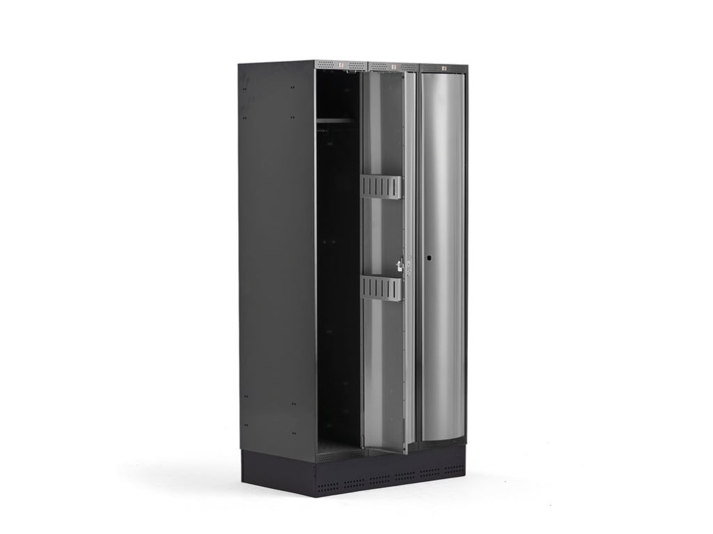 Wardrobe with curved doors and plinth base. Each folder has a storage shelf, a hanging rod with two hooks, an opening limiter, two door compartments and ventilation holes at the top and bottom. Locks are ordered separately. Elegant cabinets with their unique design add style to any interior. Convex doors painted in metallic colors look modern and are suitable for entrance areas and wardrobes. Lockers provide ample space for storing personal belongings in sports facilities, at the workplace and in various public buildings. They can be placed in the entrance areas and thus enable visitors to easily and quickly store their clothes. The wardrobes are well equipped and offer everything you would expect from wardrobes. Two folders on the door are especially suitable for storing small items, e.g. toiletries and keys. The ventilation holes in the upper and lower part of the skeleton help the proper circulation of air and remove moisture. The cabinets have a fully welded steel skeleton with a thickness of 0.7 mm. Convex-shaped doors have rubber stops for silent closing. The cabinets are delivered including a practical plinth, which is made of black steel sheet. The plinth makes cleaning easier and prevents things from falling under the cabinet. It prevents the formation of dust and dirt under the cabinet. Locks are ordered separately, choose the type that suits your needs.Be the first who will post an article to this item!