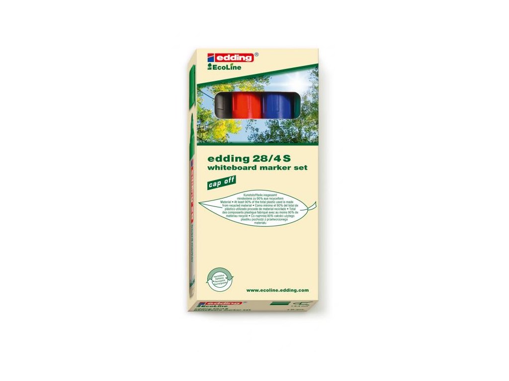 Popisovač na biele tabule, za sucha stierateľný prakticky zo všetkých neporóznych povrchov, ako je keramická úprava, melamín i sklo. Minimálne 80 % plastovej časti je vyrobených z recyklovaného materiálu. Okrúhly hrot, šírka stopy 1,5 - 3 mm. Rýchloschnúci, vodeodolný, slabo zapáchajúci atrament intenzívnej farby. Krátky čas vydrží neuzavretý bez vyschnutia. Dodávaný v sade 4 ks.