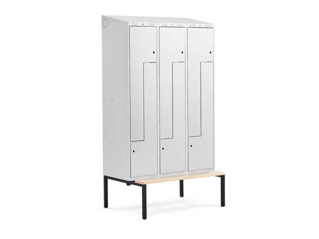 Uzamykateľná skrinka na oblečenie so šikmou strieškou pozostávajúca z dvoch častí, z ktorých každá má dve priehradky. Každá priehradka má zarážku dverí, háčik na zavesenie avetranie. Dodáva sa s rámom na nožičkách. Dodáva sa bez zámkov. Uzamykateľné skrinky Z sú skvelým riešením pre zóny s obmedzeným priestorom. Sú skvelou alternatívou pre priestory, kde nie je dostatok miesta pre uzamykateľné skrinky s dverami, pričom ponúkajú rovnako dobré riešenie. Tieto kovové uzamykateľné skrinky sú stabilné, pevné a odolné. Sú ideálne pre rôzne prostredia, najmä pre školy a šatne na pracoviskách. Vo vnútri je dostatok priestoru na zavesenie a uloženie vecí, ako sú odevy, tašky alebo prilby. Rám a dvere sú vyrobené z práškovo lakovaného oceľového plechu, čo zabezpečuje pevný povrch odolný voči nárazom aveľkému opotrebovaniu. Rám je v nenápadnej svetlosivej farbe so zošikmenou strieškou, čo zabraňuje hromadeniu prachu a uľahčuje čistenie. Dvere majú hrúbku 18 mm a pozostávajú z dvoch plátov, ktoré sú spolu zvarené. Uzamykateľné skrinky sú dobre vetrané cez otvory nahornom aspodnom okraji. Každá priehradka je vybavená háčikom na zavesenie odevov. Dvierka majú zarážku, ktorá zabráni ich otvoreniu na viac ako 90˚. Skrinka vtvareZ sa dodáva vzmontovanom stave. Vyberte vhodný zámok apridajte základný rám avytvorte si dokonalý úložný priestor. Uzamykateľná skrinka sa dodáva s praktickým rámom s lavičkou vyrobeným zo zváranej, práškovo lakovanej ocele s lakovaným borovicovým sedadlom a nastaviteľnými nožičkami. Rám s lavičkou poskytuje pohodlnú výšku na sedenie a uľahčuje aj upratovanie pod skrinkou.Buďte prvý, kto napíše príspevok k tejto položke.