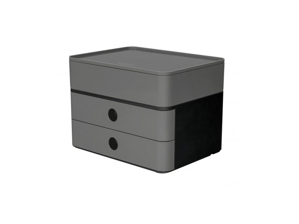 Moderný zásuvkový box v štýlovom dizajne s premyslenými detailami sa inšpiruje fl exibilitou a moderným životným štýlom. Obsahuje odkladač s vekom a vyberateľnou miskou a 2 zatvorené zásuvky s oddeľovačmi a inteligentným otvorom pre kábel. Veko sa dá použiť ako servírovacia tácka. Rozmery (š × v × h) 260 × 195 × 190 mm. Farba sivá.Dodatočné parametre